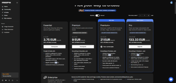 هل أنت مبدع محترف تحتاج إلى القوة الكاملة لمكتبة Freepik الضخمة، مع جرعة ذكية من أدوات الذكاء الاصطناعي دون أن تدفع ثمن ميزات قد لا تستخدمها؟